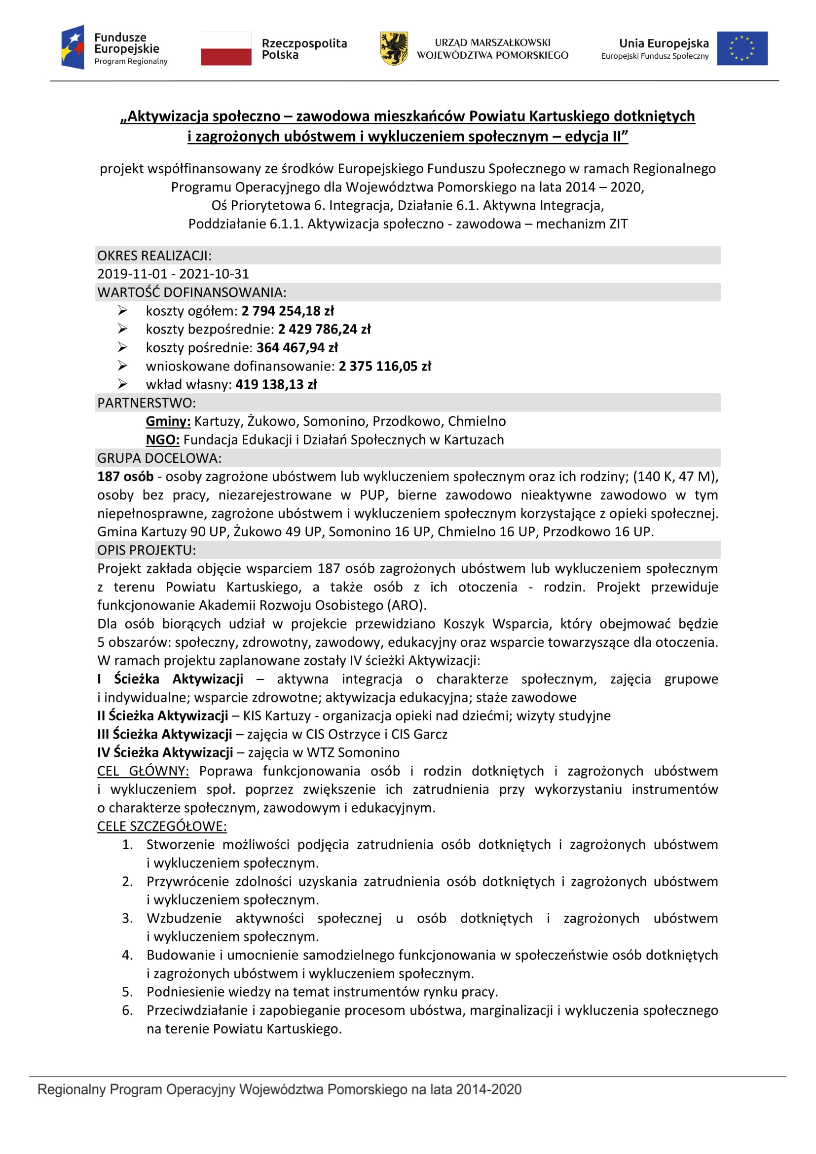 Aktywizacja społeczno – zawodowa mieszkańców Powiatu Kartuskiego dotkniętych i zagrożonych ubóstwem i wykluczeniem społecznym – edycja II
