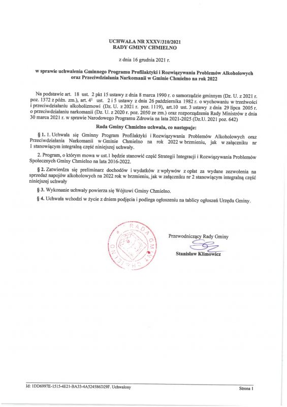 Uchwała nr XXXV/310/2021 Rady Gminy Chmielno
